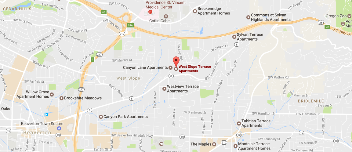 West Slope Terrace is right off of Canyon Lane which runs directly into Canyon Road / Tualatin Valley (TV) Highway. This provides easy access to both the US 26 and 217 freeways. West Slope is also just minutes away from other major streets such as Beaverton Hillsdale Highway / Farmington Road, Scholls Ferry Rd and Murray Boulevard.